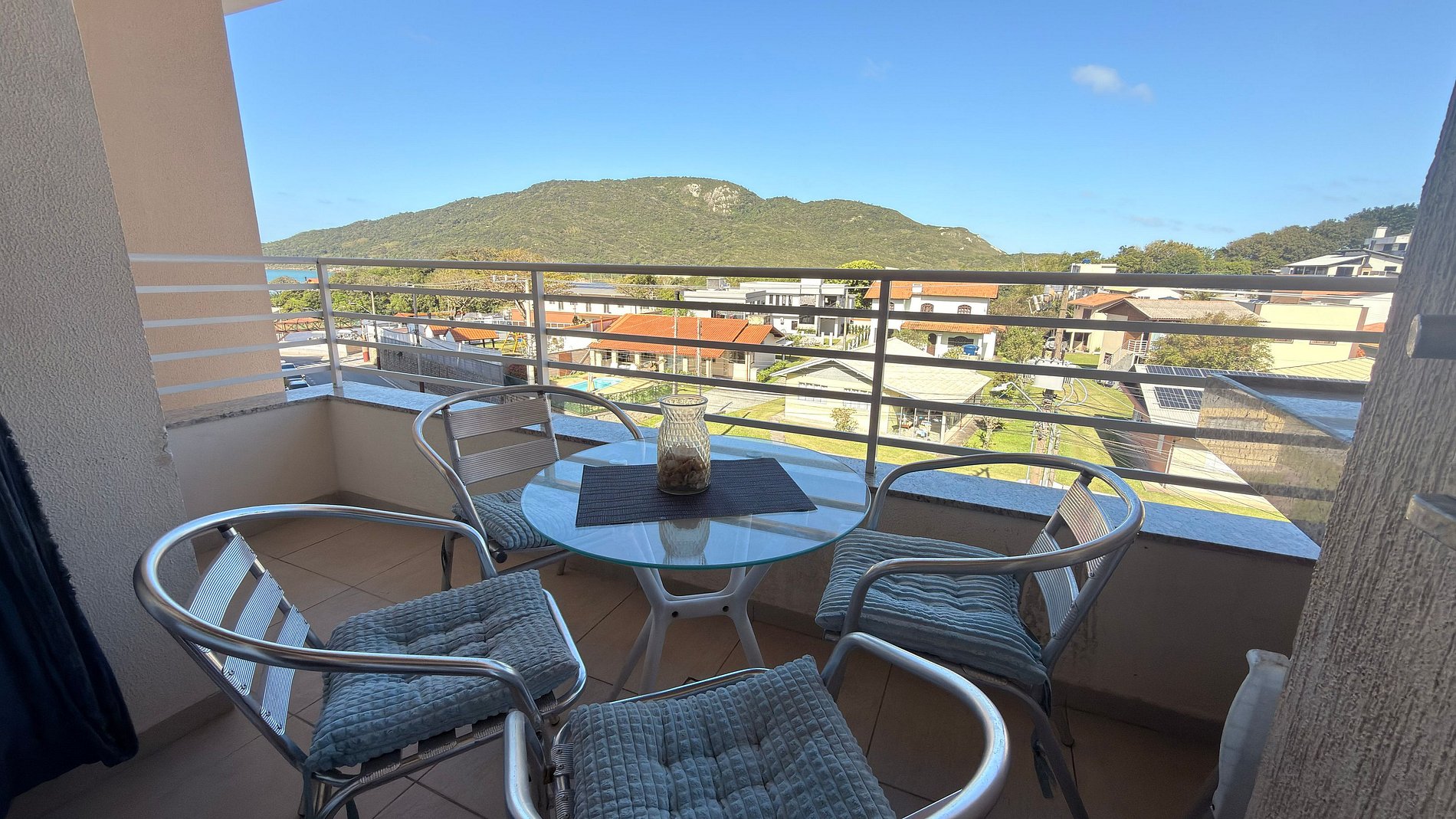 Desfrute da vista para montanhas, dunas e mar neste apartamento aconchegante com varanda e churrasqueira.